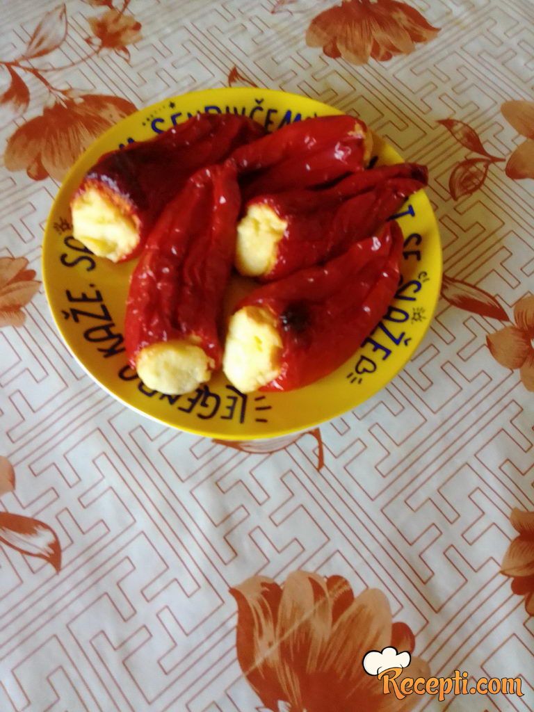 Umutiti sir i jaja, dodati pavlaku i griz dobro izmešati i puniti očišćene paprike. Poređati ih u tepsiju obloženu papirom za pečenje. Paprike posuti po neku kap ulja i peći 20 minuta na 200 stepeni.