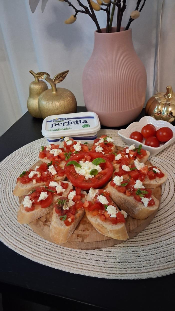 Iseckati paradajz na kockice, dodati kašiku maslinovog ulja i izmešati. Izdrobiti sir i sitno naseckati listiće bosiljka. Na baget složiti kockice paradajza, pa dodati sir i posuti seckanim bosiljkom.