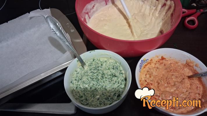U brašno sipati sir i jaja i izmešati. Dodavati jogurt i mešati dok se ne postigne željena gustina smese. Potrebno je oko 500 ml gustog jogurta. Odvojiti dve četvrtine smese i u jednu dodati spanać i malo bibera, a u drugu ajvar i alevu papriku. Polovinu smese ostaviti svetlu.
