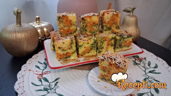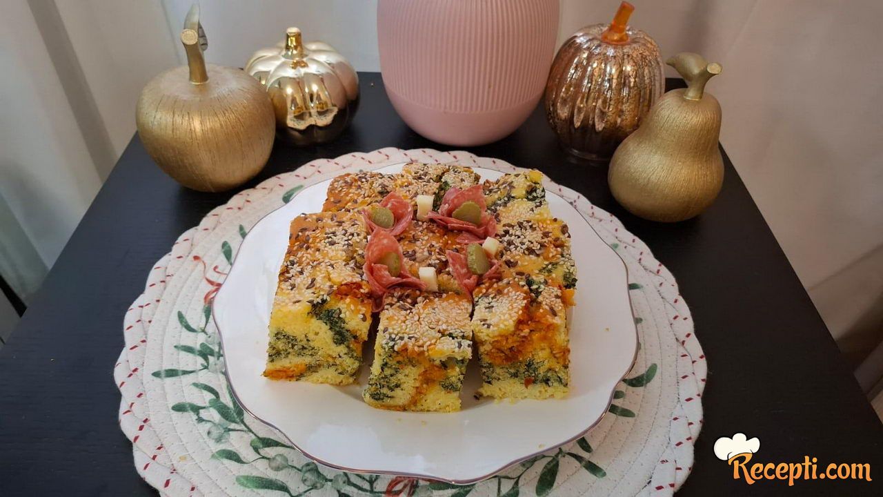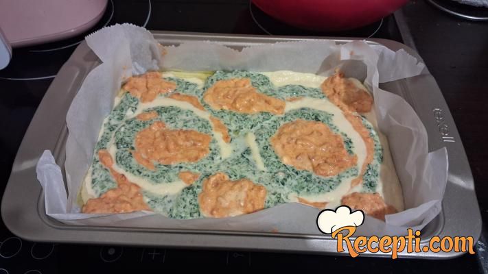 Tepsiju, dimenzija 22x32 cm, obložiti pek papirom i premazati ga jednom kašikom ulja. Kutlačom sipati belu smesu na dva mesta, pa u sredinu sipati smesu sa spanaćem, a preko smesu sa ajvarom.
