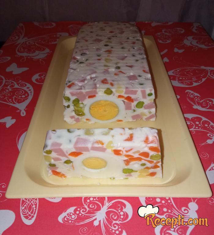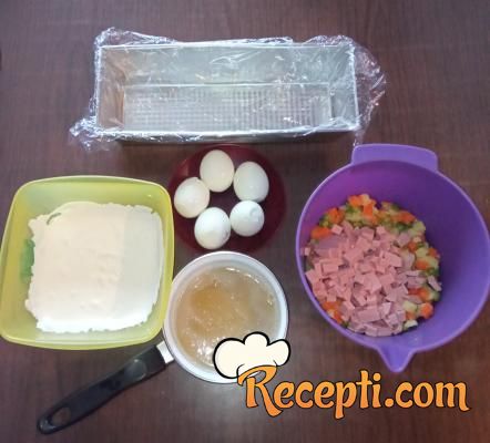Pomešati pavlaku i majonez. Želatin rastopiti na vatri, ali ne sme da provri. Postepeno želatinu dodati 2-3 kašike mešavine majoneza i pavlake i izmešati. Zatim sipati u ostatak majoneza i pavlake. Dobro promešati. Povrću dodati na kocke seckanu šunku ili salamu, sipati smesu od pavlake, majoneza i želatina i izmešati.