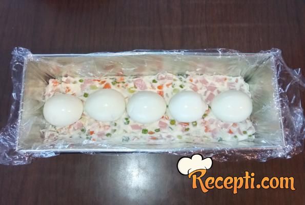 Kuvana jaja oljuštiti. Kalup za hleb obložiti folijom. Polovinu smese sipati u kalup. Proređati kuvana jaja. Preko rasporediti ostatak smese.