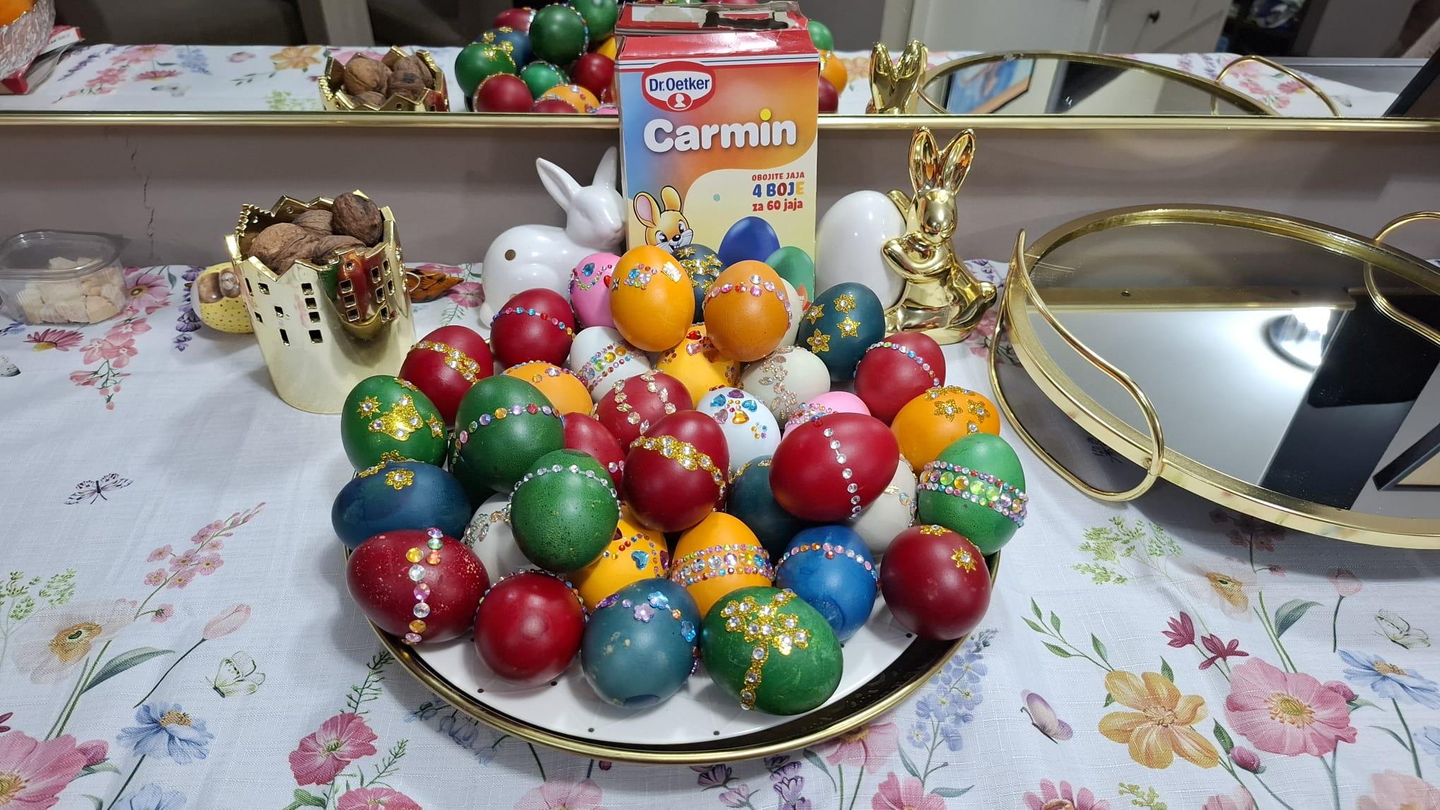 Skuvati 30 običnih jaja i 20 izbeljenih. Kuvaju se oko 15 minuta na umerenoj temperaturi. U isto vreme pripremiti boje prema uputstvu na pakovanjima. U odvojenim činijicama ih razmekšati i pomešati sa sirćetom.