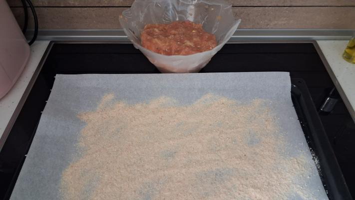Dobro sve izmešati i ostaviti da odstoji 10 do 15 minuta. Na pek papir sipati prezle i na njima rastanjiti smesu u pravougaoni oblik.