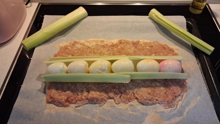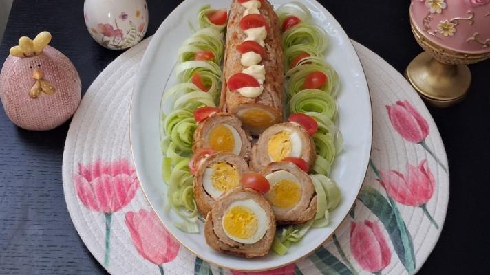 Po jednoj ivici rasporediti kuvana jaja. Da bi stajala pravo, najbolje ih je poređati u struku većeg praziluka, koji možete da ostavite da se ispeče u rolatu, ili da ga lagano izvučete pre zamotavanja mesa.