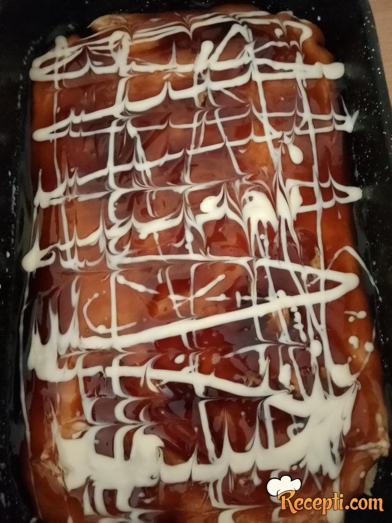 Pomešati 800 ml mleka sa 500 ml slatke pavlake. Koru staviti u dublji pleh i preliti sa mlekom.