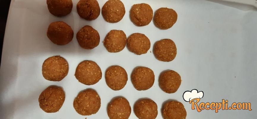 U mlevene keks dodajte sok od pomorandže i sitno narendanu koru pomorandže, pa onda postepeno dodajte kašiku po kašiku džema i mesite smesu da dobijete meku, ujednačenu, kompaktnu smesu (koja se ne troši). Formirajte bombice željene veličine.