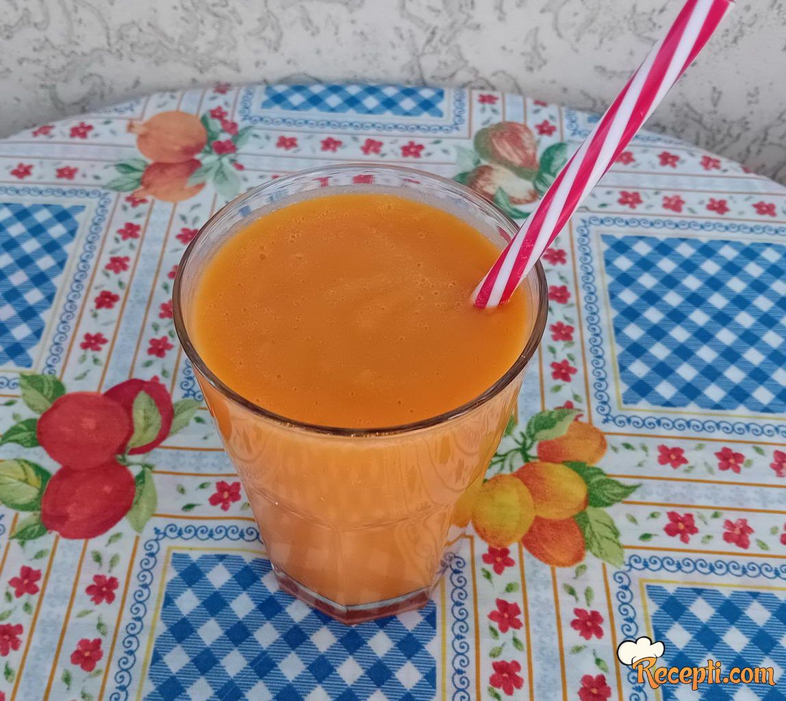 Oljuštiti šargarepu, naseckati i staviti u blender. Jabuku oljuštiti, očistiti od semenki, naseckati i staviti u blender. Dodati đumbir, limunov sok, vodu i sve sjediniti u blenderu. Sipati u čašu. Dobro rashladiti pre služenja.