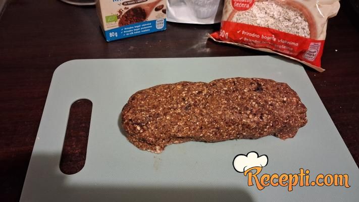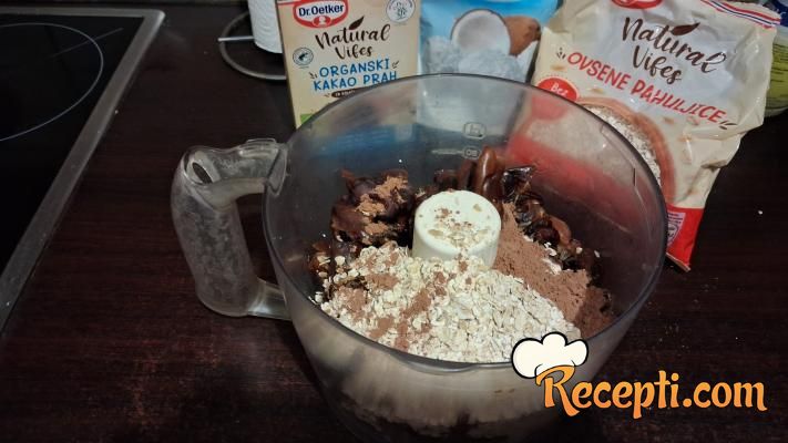Očistiti od koštica urme koje su odstojale u vreloj vodi oko sat vremena. Sipati ih u seckalicu i dodati ovsene pahuljice i kašiku kakaoa.