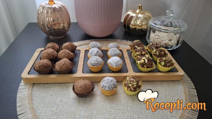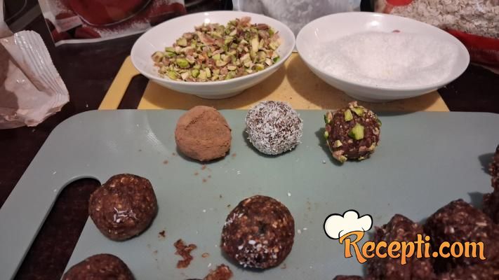 Oblikovati kuglice i uvaljati ih u orašaste plodove, kokos ili jednostavno samo u kakao. Bilo koju oblogu da odaberete ukus je izuzetno lep.