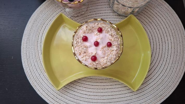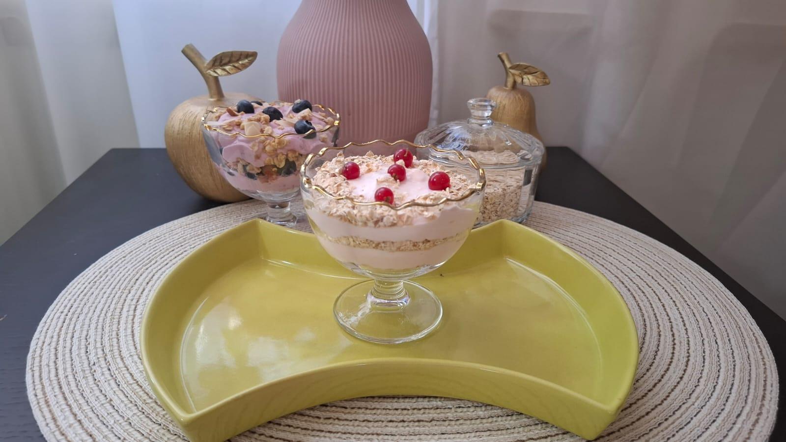 Na dno čaše sipati 2-3 kašike ovsenih pahuljica i preko njih 150 ml voćnog jogurta po želji (jagode,...). Preko jogurta rasporediti drugi sloj pahuljica, pa još 150 ml voćnog jogurta. Po vrhu napraviti venčić od pahuljica i dodati malo bobičavog voća koje vam je na raspolaganju. Ostaviti kratko da odstoji i da pahuljice malo povuku vlagu iz jogurta. Ukus je savršen!