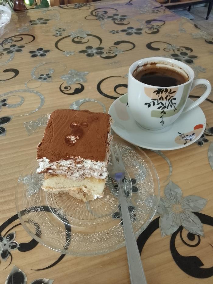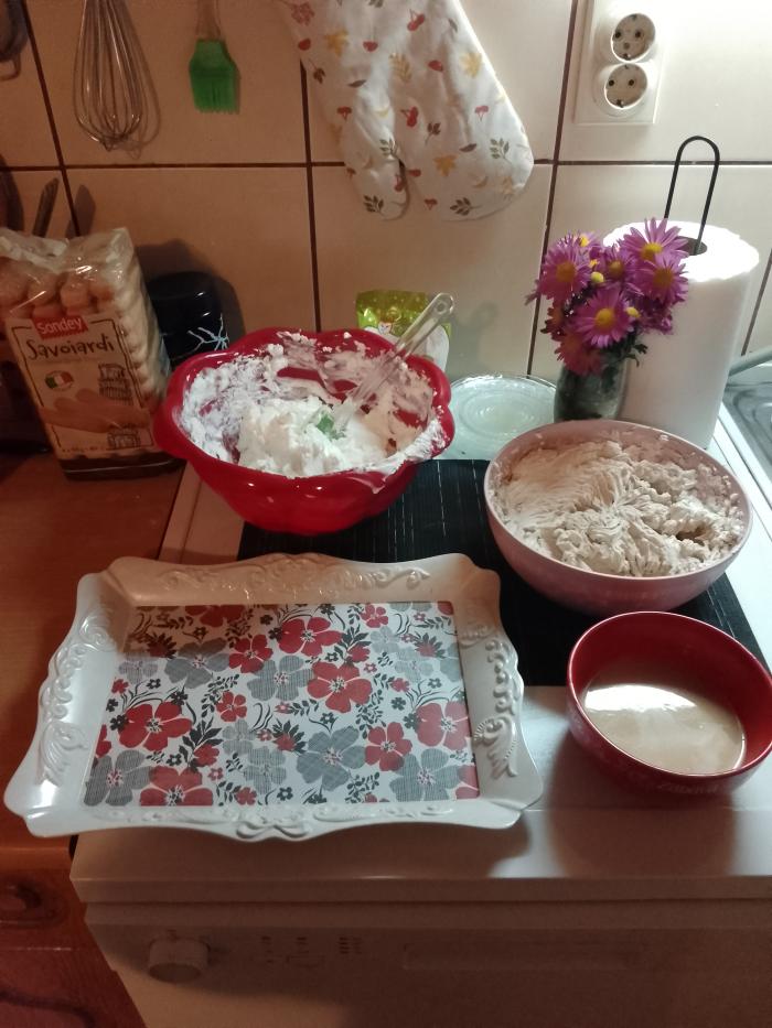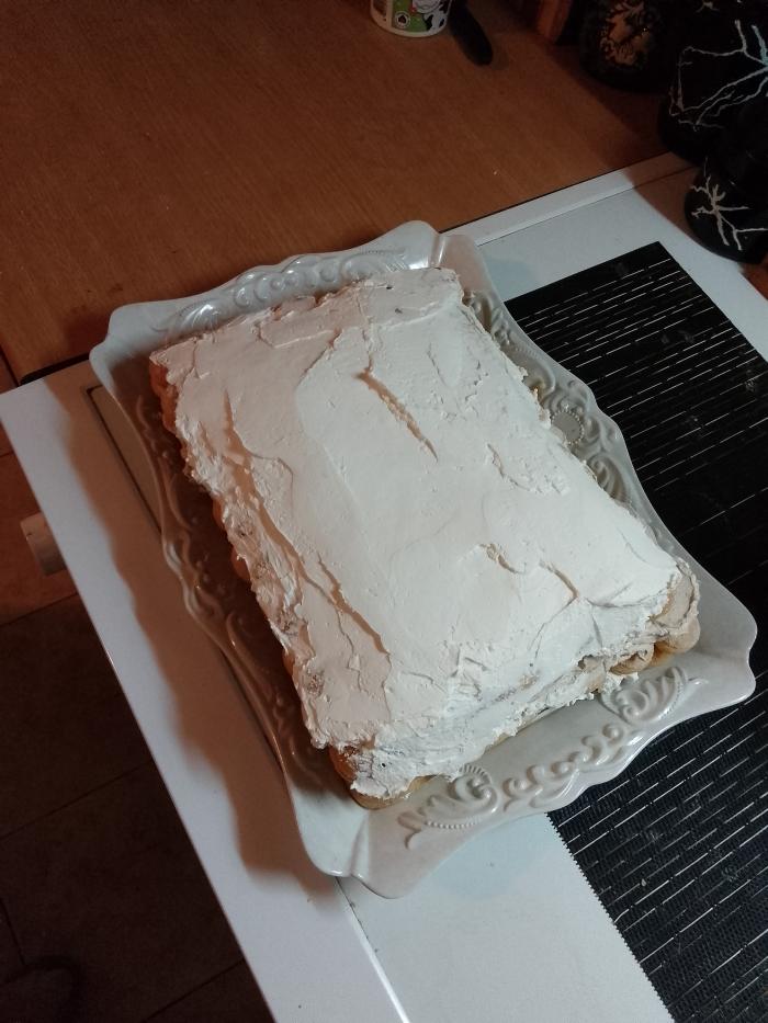 Pripremiti nes kafu, umakati piškote i ređati na tacnu za tortu, pa preko prvog reda beli deo, pa piškote umakati i opet složiti, pa braon fil, pa piškote i opet beli fil.
