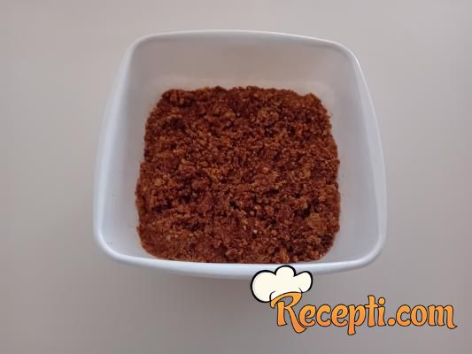 Posudu izvaditi iz frižidera. Uzimati po malo smese, dlanovima oblikovati kuglice, valjati ih u mleveni keks i poređati na tanjir.