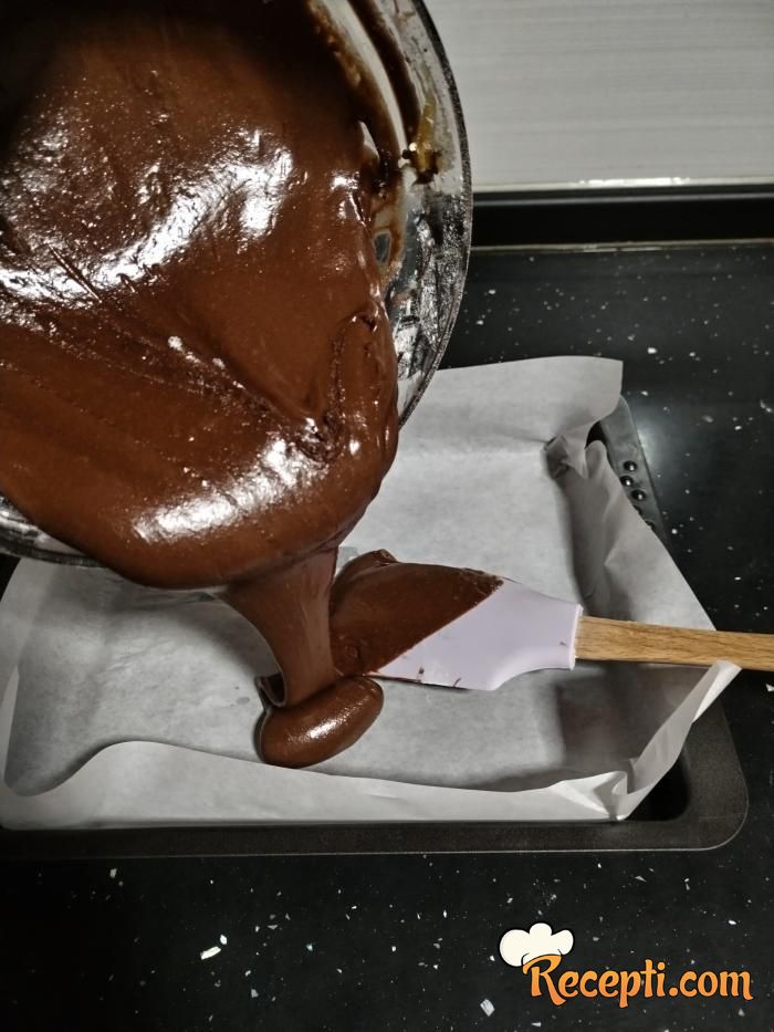Smesu sipajte u pekač 20x20 cm obložen papirom za pečenje.