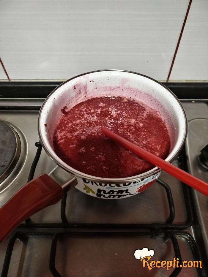 Sjedinite 100 ml vode i prašak za puding da nema grudvica. Sipajte u maline i kuvajte dok se ne zgusne.