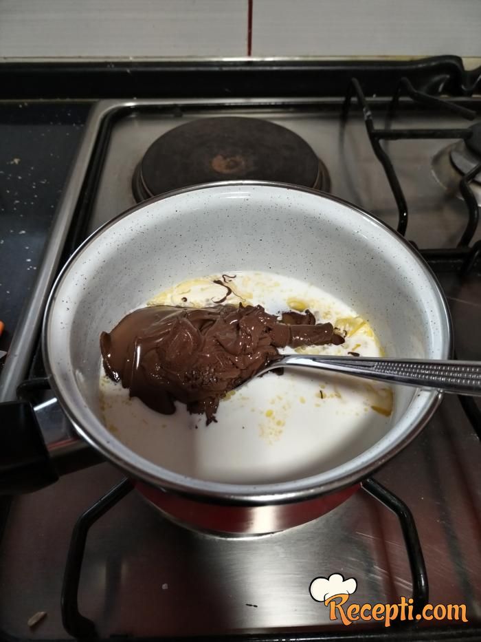 Za pripremu glazure: Sjedinite vruću slatku pavlaku i otopljenu čokoladu. Dodajte med i maslac. Promešajte da se sve otopi i sjedini.