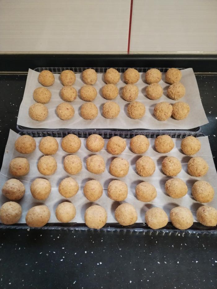 Rukama razvaljajte smesu u kuglice i stavite ih na pleh obložen papirom za pečenje.