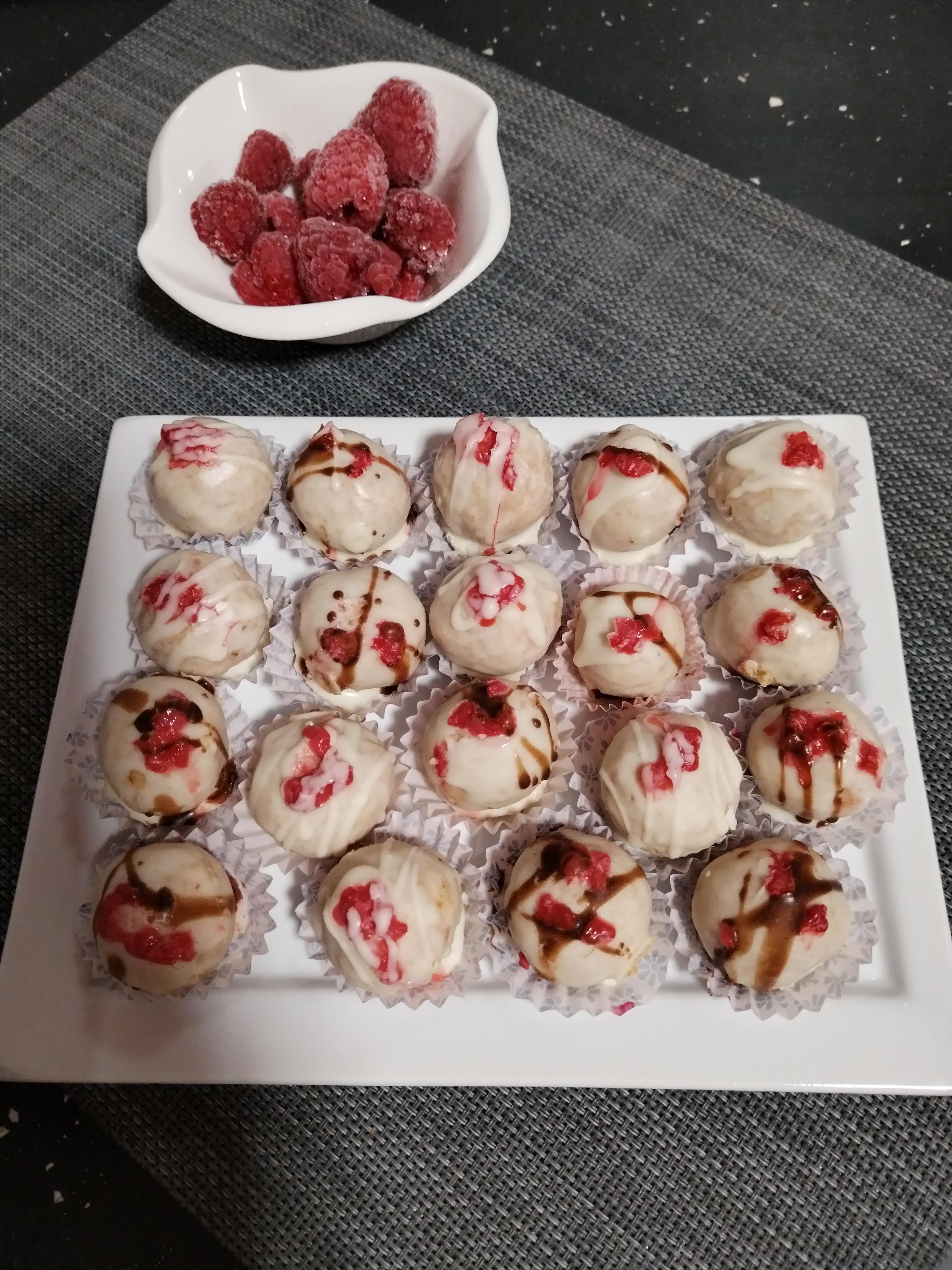 Za dodatni ukus, svaku kuglicu pospite svežom malinom i prelijte dodatnom otopljenom belom čokoladom. Ohladite kuglice najmanje 30 minuta pre serviranja.