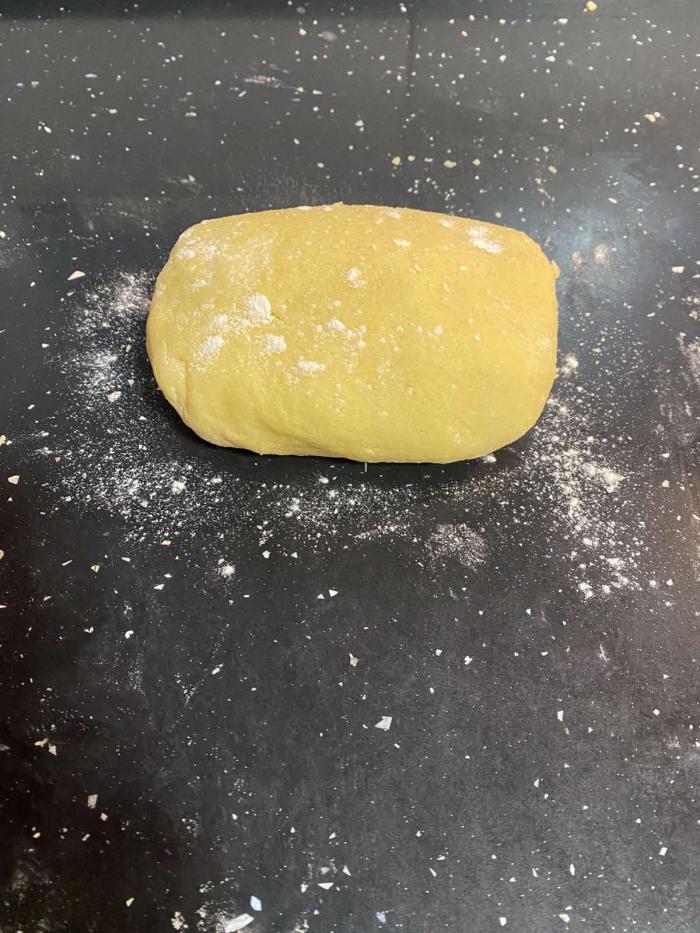 Za testo dodajte brašno i prašak za pecivo u posudu. Pomešajte sastojke i napravite udubljenje u sredini. Dodajte šećer, vanilin šećer, jaje, žumance i margarin sobne temperature. Umesite testo.