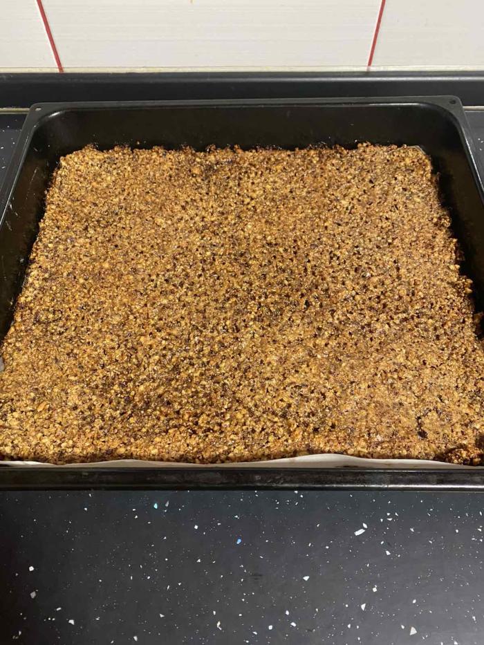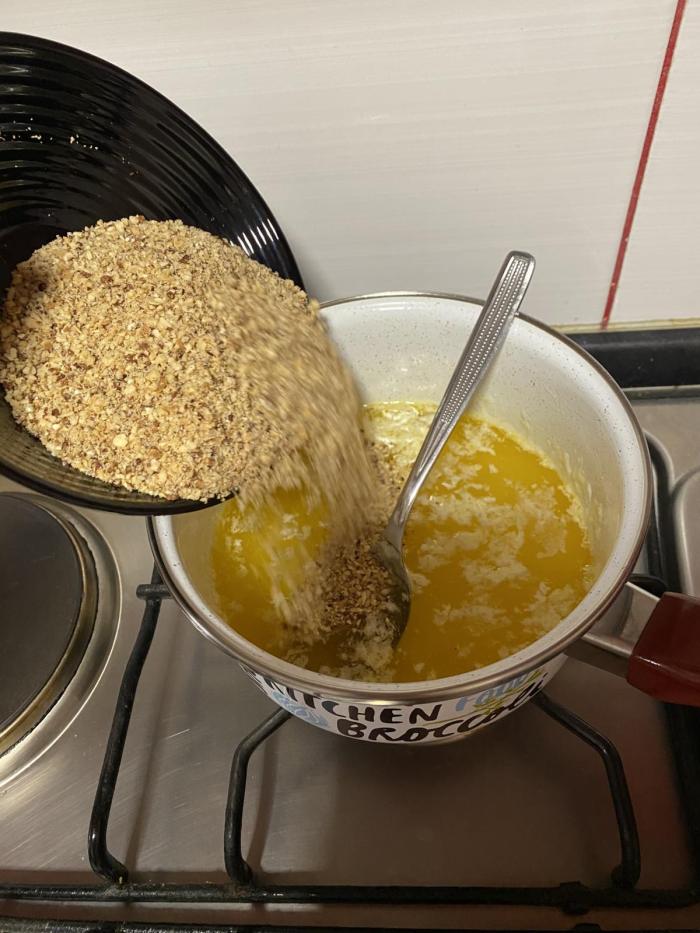 U šerpu dodajte iseckani margarin, šećer, vanilin šećer i vodu i stavite da proključa. Kada se sastojci istope sklonite šerpu sa strane. Dodajte pečene seckane lešnike i pečene mlevene lešnike i sve zajedno izmešajte.