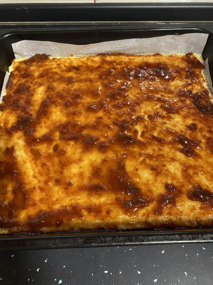 Podmažite i pobrašnite pleh dimenzija 31x33 cm. Testo stavite na papir za pečenje. Pokrijte drugim komadom papira za pečenje i malo pritisnite. Rasklagijajte testo do veličine pleha. Dok ga razvaljate, možete po potrebi ukloniti papir i zalepiti višak testa gde je potrebno. Pripremljeno testo prebacite u pleh za pečenje. Polako odlepite papir.