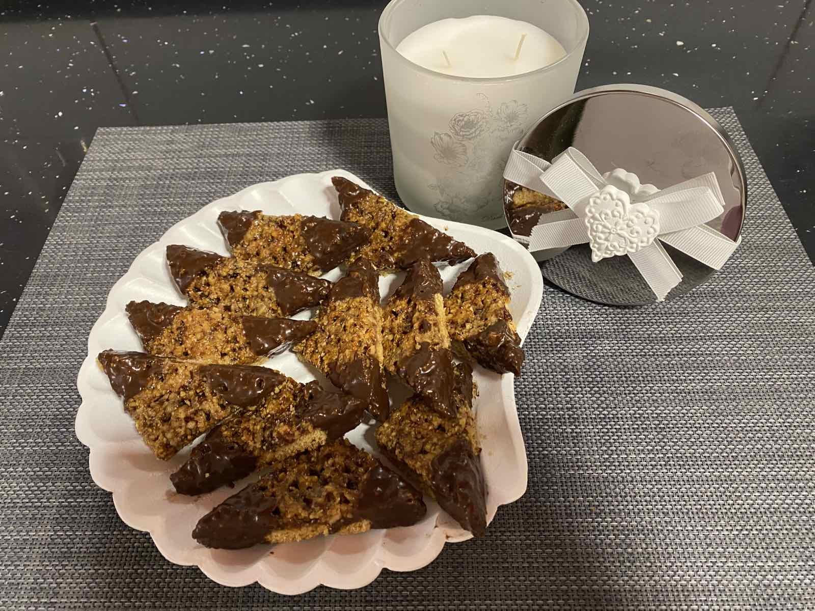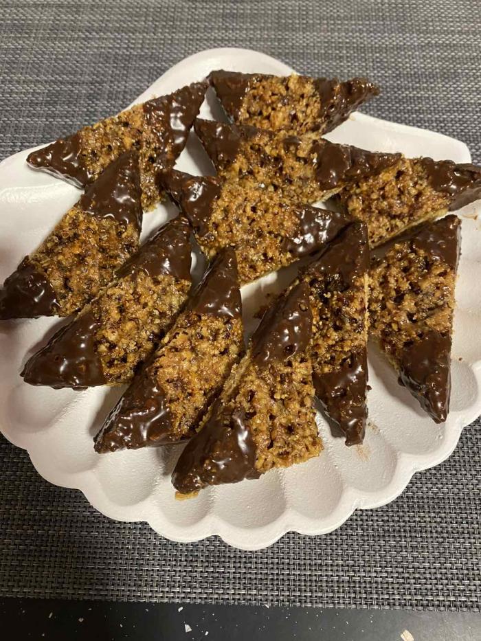 Pecite kolač u zagrejanoj rerni na 180 stepeni 20-25 minuta. Ostavite da se potpuno ohladi. Isecite ga na jednake trake horizontalno, a zatim na jednake trake vertikalno. Zatim ga isecite dijagonalno i dobićete trouglove.