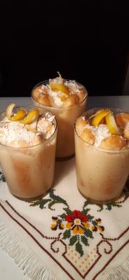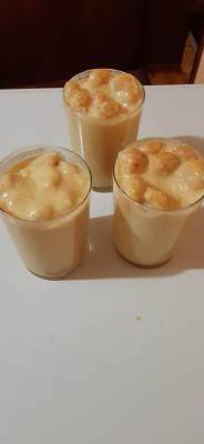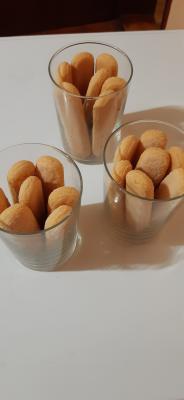 Ja sam spremala samo tri velike (duple) porcije deserta pa sam u velike čaše (od 4 dl) stavljala po 7 celih piškota. Ako spremate 6 porcija koristite klasične čaše od 2 dl ili činijice za puding i u svaku činijicu stavite po 4 piškote prelomljene na 3-4 dela i namočene u malo mlakog mleka.
