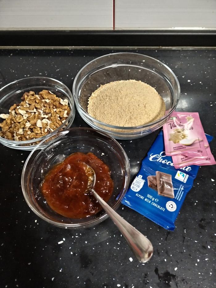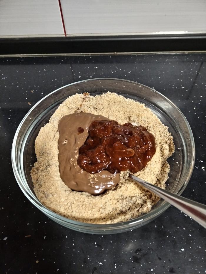 Zatim dodajte istopljenu čokoladu pa promešajte i postepeno dodajte pekmez od kajsija da se dobije fina smesa pogodna za oblikovanje kuglica.