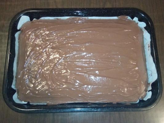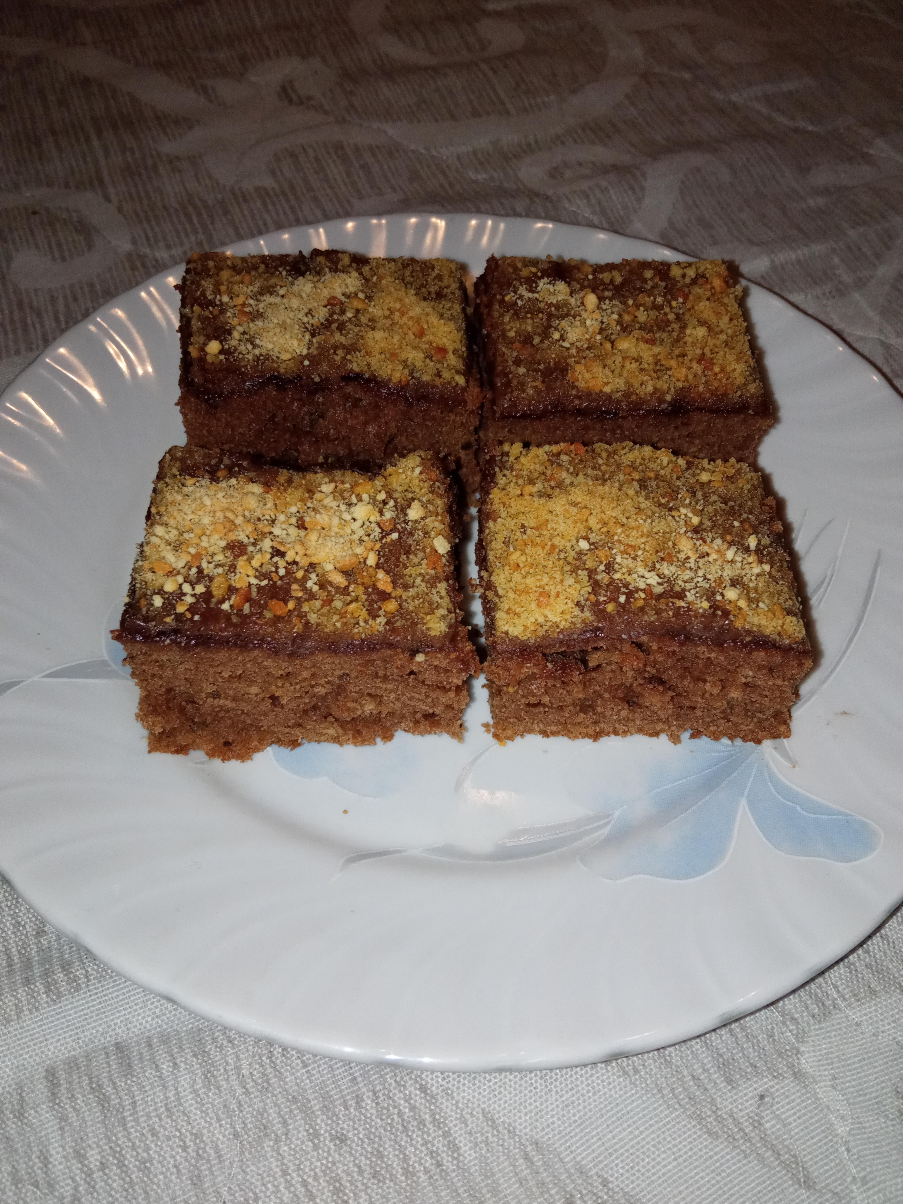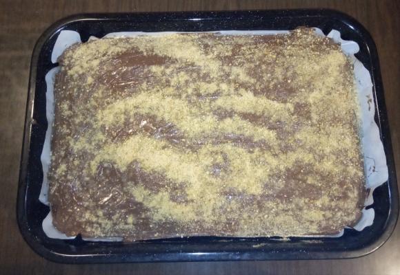 Vruć kolač premazati eurokremom i posuti plazmom. Ostaviti da se ohladi. Seći na kocke i poslužiti.