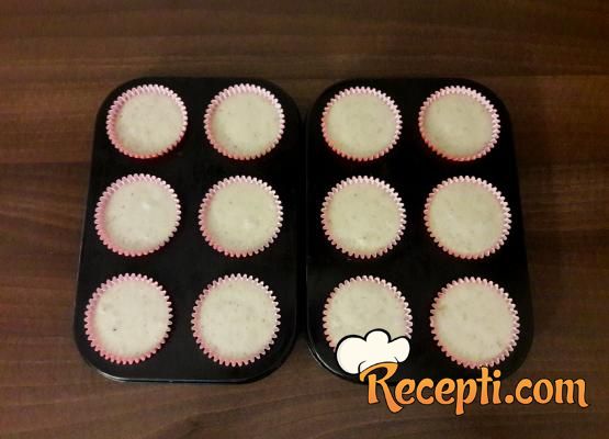 U kalup za mafine staviti papirne korpice za pečenje. Smesu izliti do polovine papirne korpice.