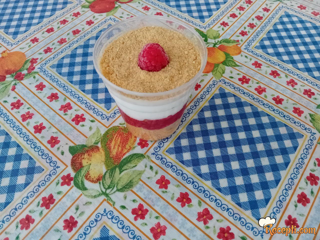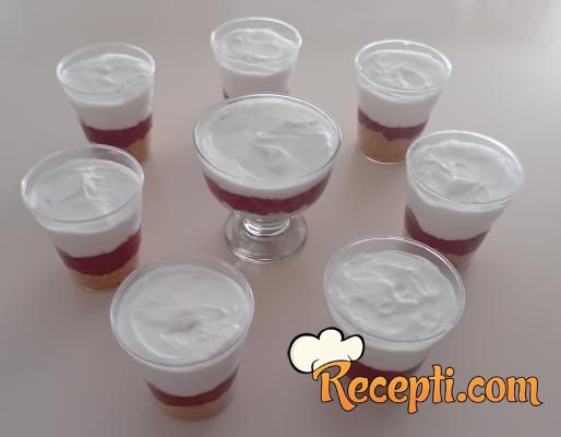 Finalni postupak: U čaše rasporediti podlogu od keksa. Preko naneti voćni deo, a zatim šlag.