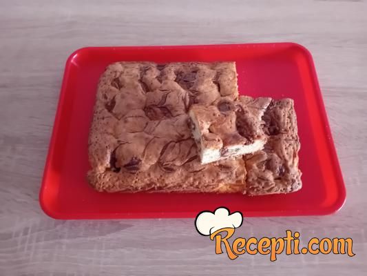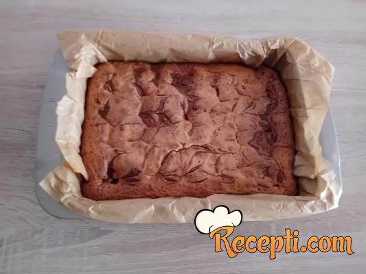 Mikserom umutiti jaja sa šećerom i vanilin šećerom, pa dodati otopljenu čokoladu i otopljen margarin, izmiksati te mikser isključiti. Dodati brašno, izmešati špatulom i uliti u pekač obložen pek-papirom.