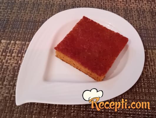 Za smesu: Mikserom umututi jaja sa šečerom i vanilin šećerom. Dodati prašak za pecivo i izmiksati. Umešati mlevenu plazmu i lagano umutiti miksrrom. Pleh premazati uljem, posuti brašnom i usuti pripremljenu smesu. Peći u dobro zagrejanoj rerni na 200 stepeni 20 minuta. Za preliv: Mleko usuti u šerpu, dodati vanilin šećer i prokuvati (čim proključa skloniti sa ringle). Pečeni kolač izvaditi iz rerne, izbockati čačkalicom i vruć kolač preliti vrelim prelivom. Ostaviti da se ohladi na sobnoj temperaturim, zatim i u frižider (dobro rashladiti). Kolač seći i poslužiti.