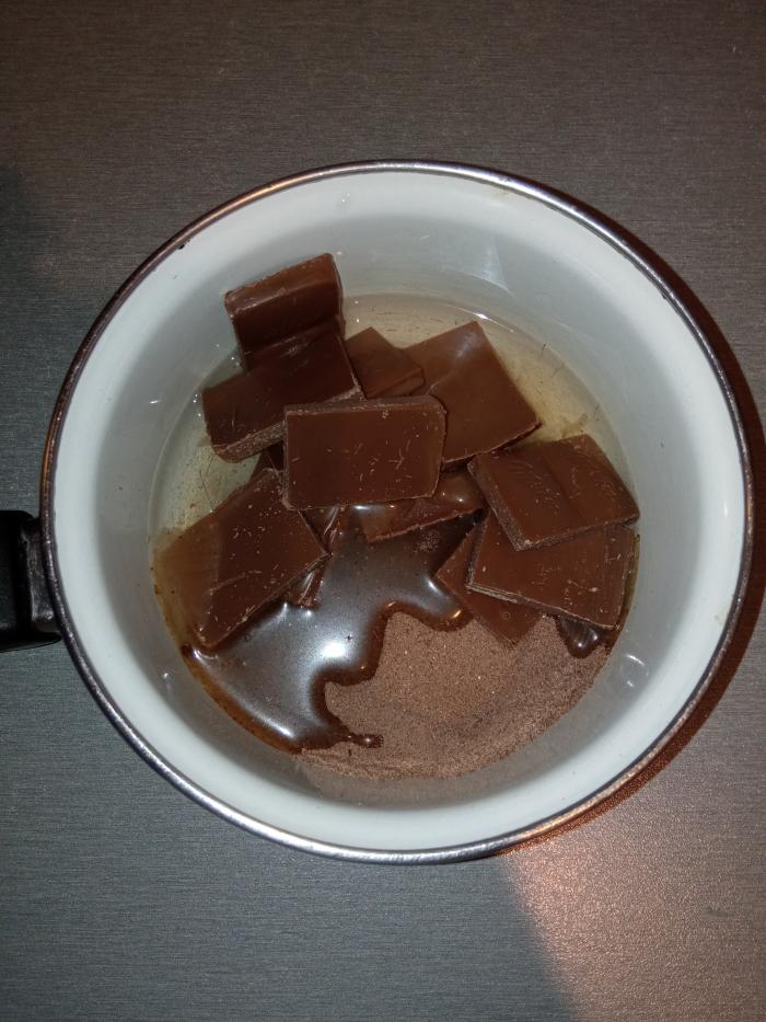 U posudu za pripremu sipati mlevenu plazmu, dodati šećer u prahu i izmešati. U posebnoj posudi sipati vodu, kesicu instant napitka i izlomljenu mlečnu čokoladu. Staviti na umerenoj temperaturi, da se zagreje, mešati dok se čokolada otopi, voditi računa da ne zagori. Prohlađenu smesu preliti preko keksa. Sve lepo izmešati i ostaviti u frižideru na oko 15 minuta da se smesa stegne.