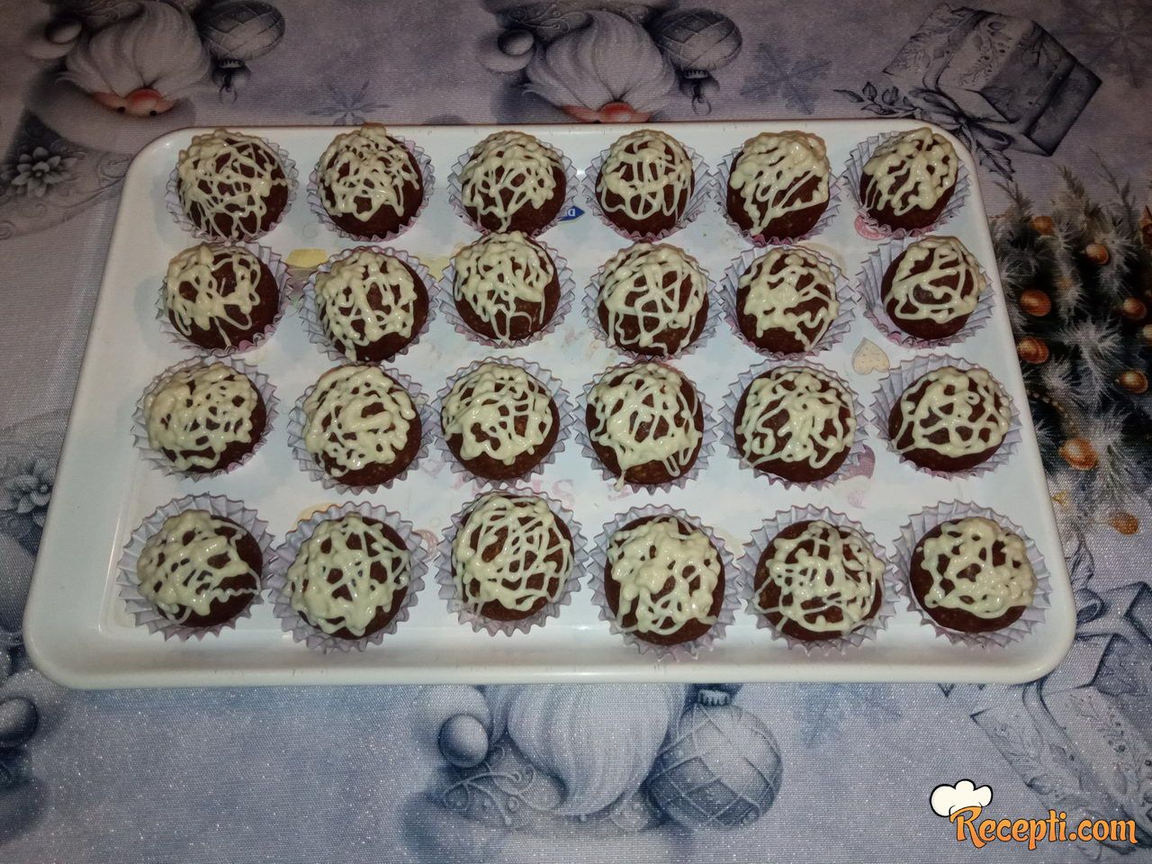 Od smese praviti kuglice i ređati u papirnim korpicama. Čokoladu otopiti i preliti preko kuglica. Vratiti na kratko u frižideru da se čokolada stegne. Poslužiti i uživati u ukusu. Prijatno.
