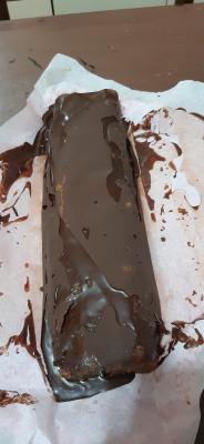 Spremiti glazuru od čokolade: nalomkanu čokoladu pomešanu sa uljem otopiti na nižoj temperaturi uz povremeno mešanje. Malo prohladiti pa preliti preko rolata. Ostaviti da se glazura skroz ohladi i stegne pa seći na parčiće.