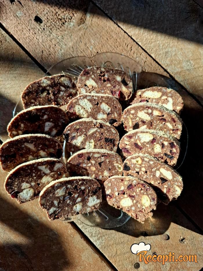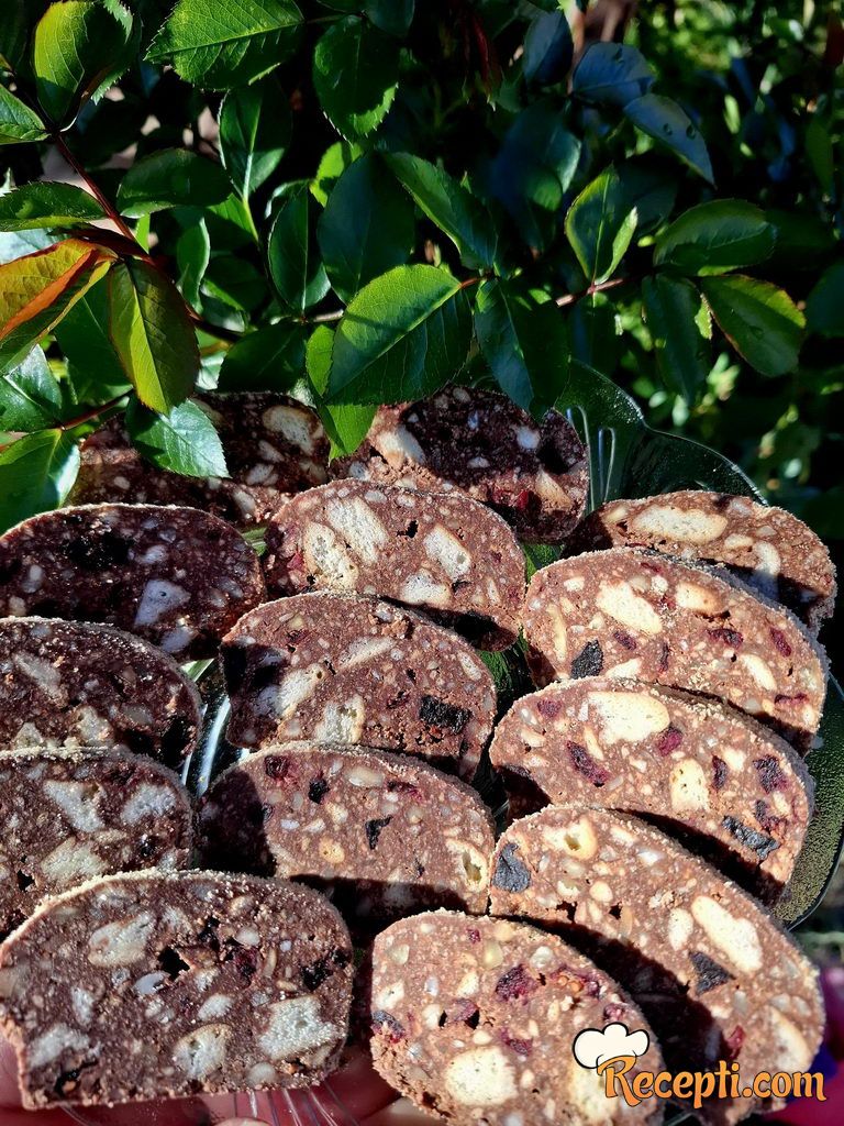 Vodu i šećer staviti da provri. Skloniti sa ringle pa dodati margarin i čokoladu, mešati dok se ne istopi. Dodati mleveni keks,keks, orahe, kajsije i brusnice. Varjačom izmešajte pa ostavite da se malo prohladi. Masu podelite na dva dela. Svaki deo posebno uviti u providnoj foliji, praveći oblik valjka. Ostaviti preko noći u frižideru da se lepo stegne, možete je uvaljati u šećer u prahu, mleveni keks....Skalpelom seći okruglice ❤️