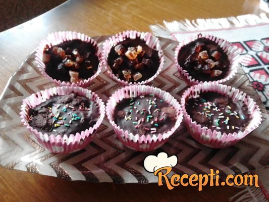 U blender staviti pahuljice, badem, kokos, cia semenke, urmei, vodu i usitniti. U kalup za mafine staviti papirne korpice i u svaku stavljati pripremljenu smesu i pritiskati sa malom čašicom. Otopiti čokoladu sa uljem i sipati u korpice i posuti sa nečim po želji.Ja sam sa seckanim žele bombonama i šarenim mrvicama.