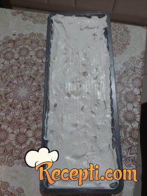 Kalup srneća leđa se premaze margarinom i pospe brašnom. Smesa se izruči i poravna.