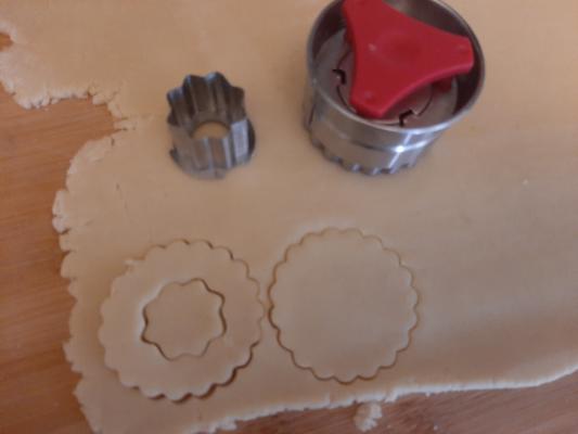Očvrslo testo rastanjiti oklagijom i modlom vaditi oblike. Poređati u pleh i peći jako kratko oko 10 do 15 minuta na 200 stepeni.