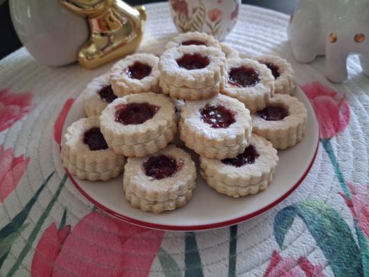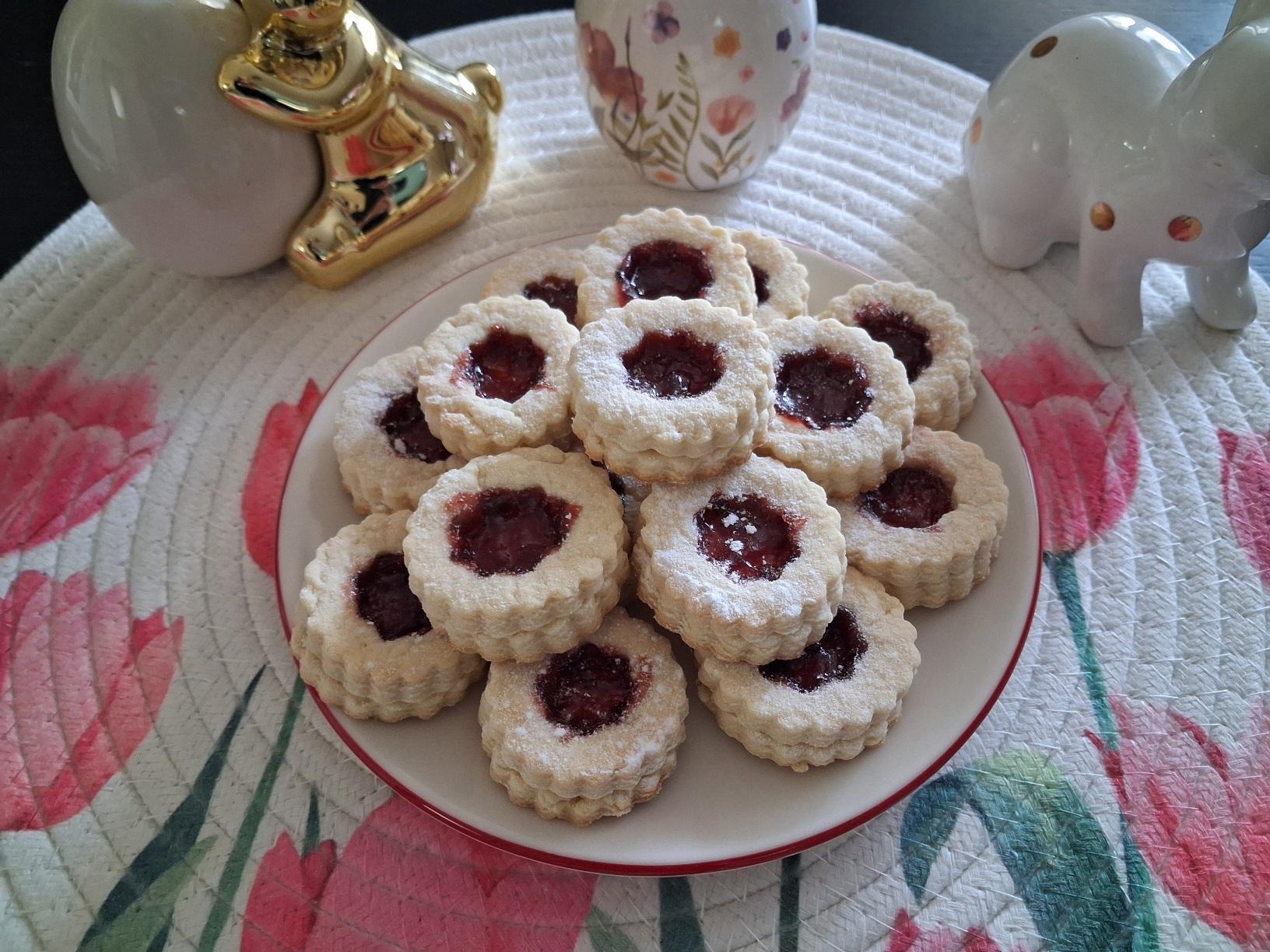 Kada poželite da ih nafilujete, premažite cele keksiće džemom po izboru i preklopite sa šupljenima. Po vrhu posuti sa malo šećera u prahu. Prijatno!