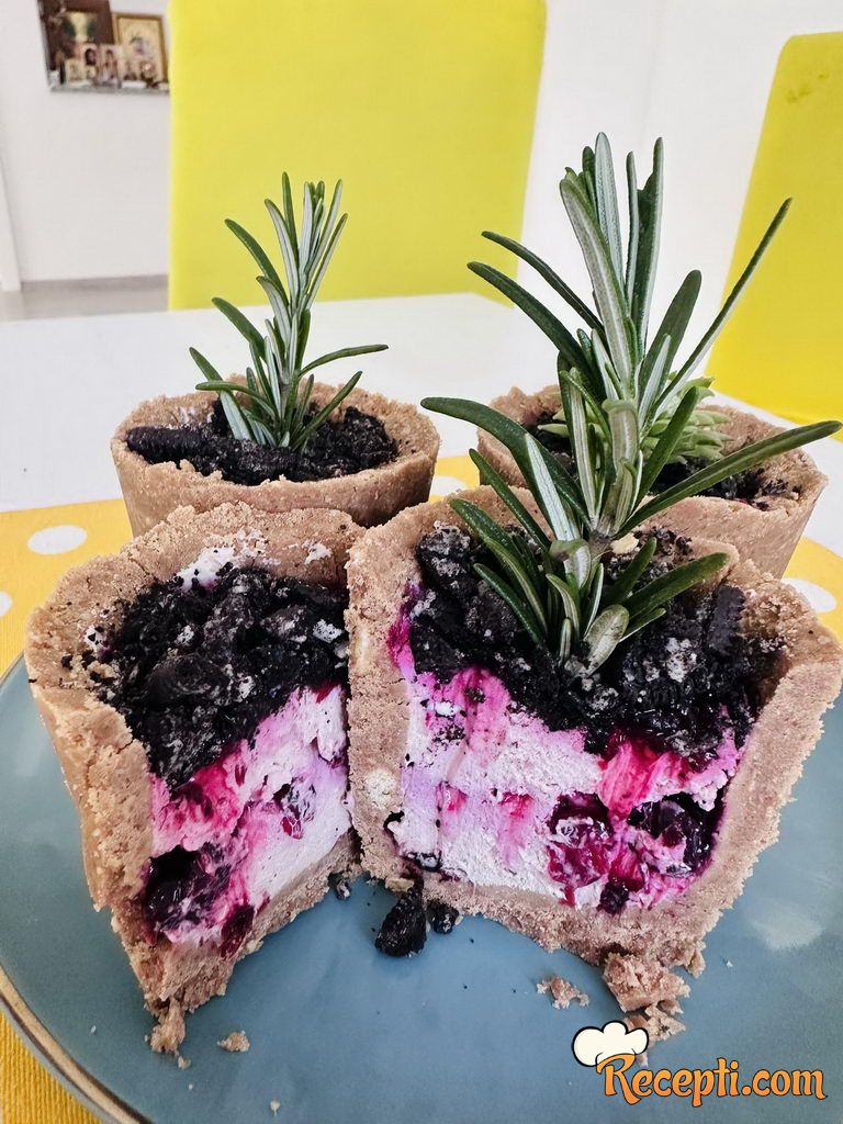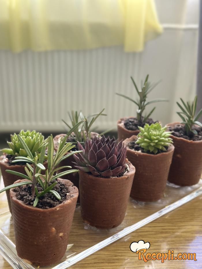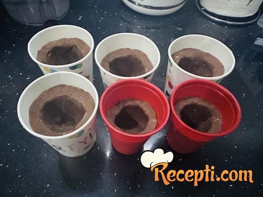 Pomješati sve sastojke za saksije i lijepo ih sjediniti u smjesu za oblikovanje. Uzeti kalup (čaše) i postaviti dno i obložiti zidove. Ostaviti u zamrzivač da se malo stegne.