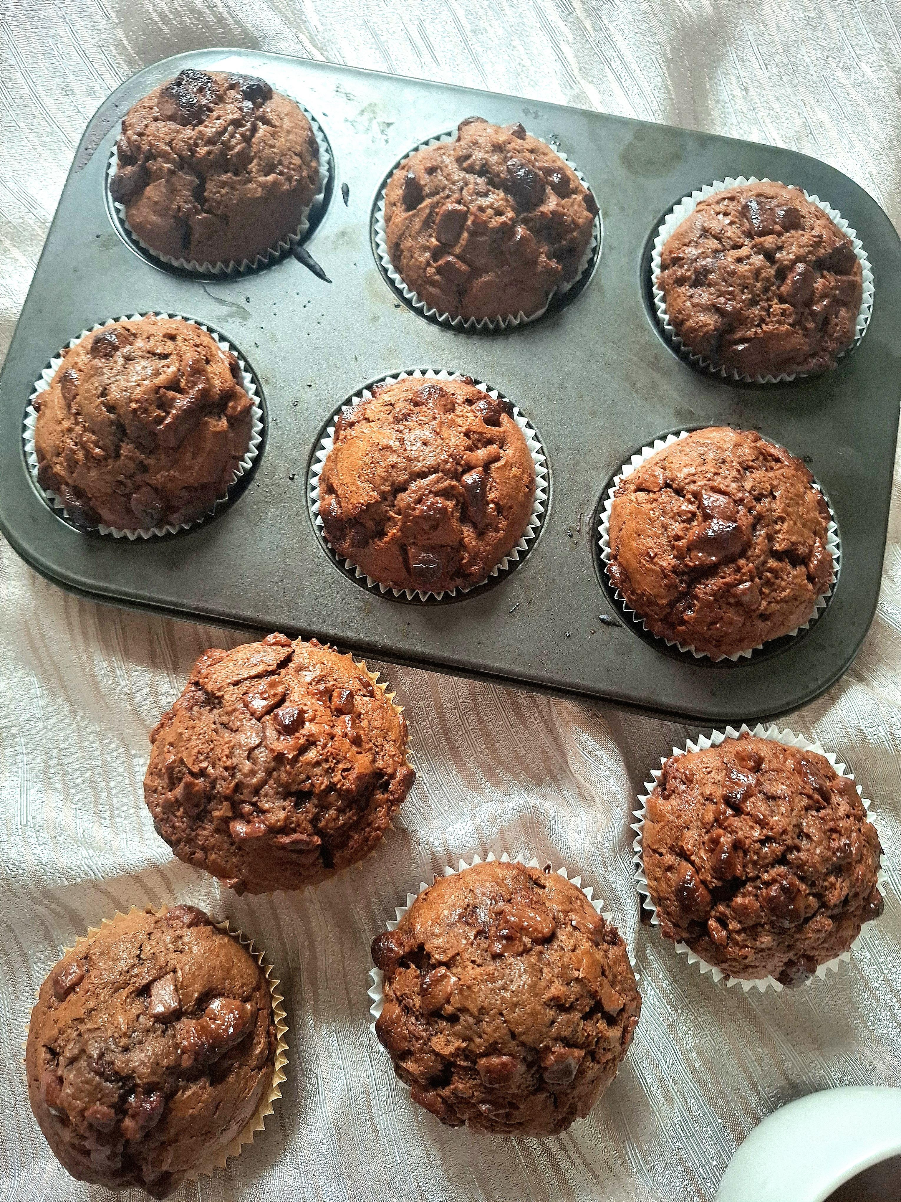 Umutite jaja sa šećerom, pa dodajte otopljeni puter i mleko. Ponovo umutite pa dodajte brašno, prašak za pecivo i kakao. Sjedinite i u testo izmešajte sitno seckanu crnu čokoladu. Punite korpice za mafine do sredine. Pecite u zagrejanoj rerni na 180 stepeni oko 20 minuta. Prijatno!