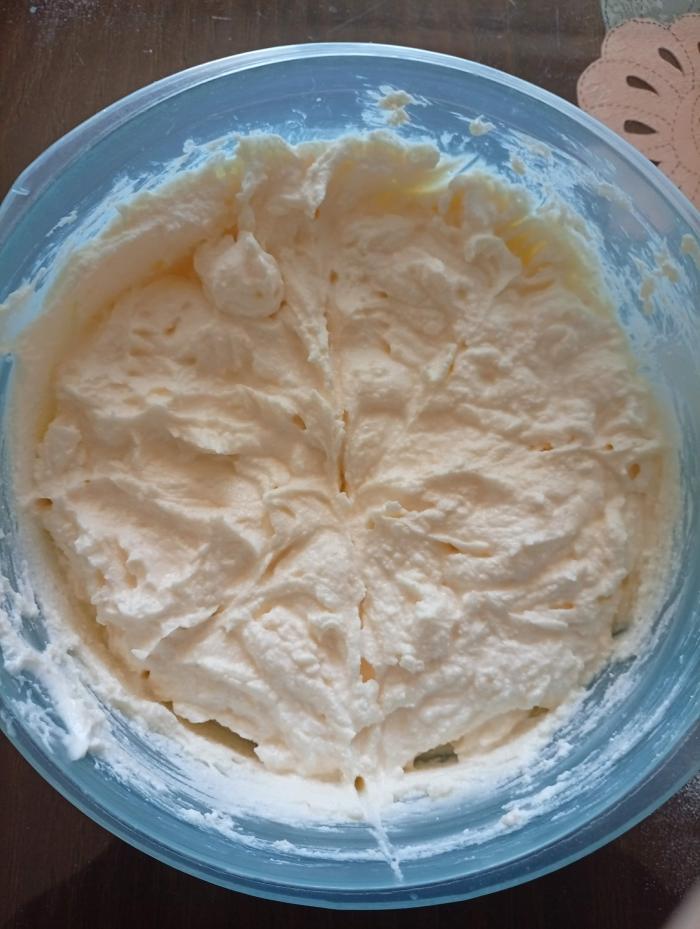 U sir dodati žumance i šećer pa lagano izmešati sa kašikom. Zatim dodati jogurt, vanilin šećer i gustin.