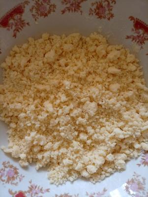 Pomešati brašno, šećer i margarin, da se dobije mrvičasto testo za posipanje.