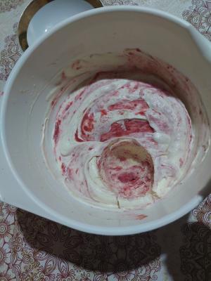 Smesu sa jagodama sipati u smesu sa vanil kremom. Kašikom malo promešati da se dobije lepa šara.