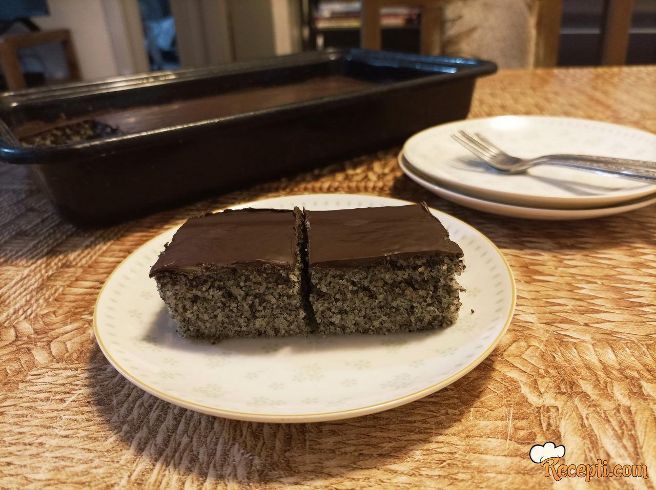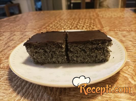 U vanglicu staviti sve suve sastojke - šećer, brašno, pšenični griz, mleveni mak (koristila sam mleveni mak bez dodataka, ako koristite mleveni mak sa dodatkom šećera, smanjite šećer u sastojcima) i prašak za pecivo. Žicom za mućenje dobro promešati da se svi sastojci sjedine. Sipati gaziranu vodu i ulje i žicom sjediniti sastojke. Testo izručiti u pripremljeni pleh, poravnati površinu i staviti da se peče 20 minuta. Pečeni kolač ostaviti da se prohladi dok se istopi čokolada.
