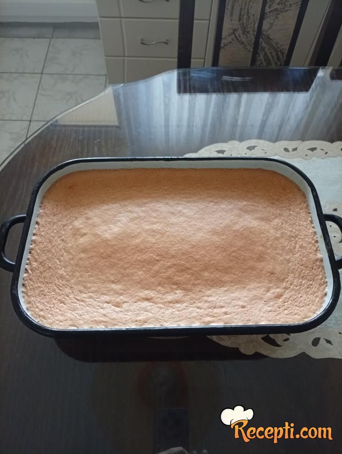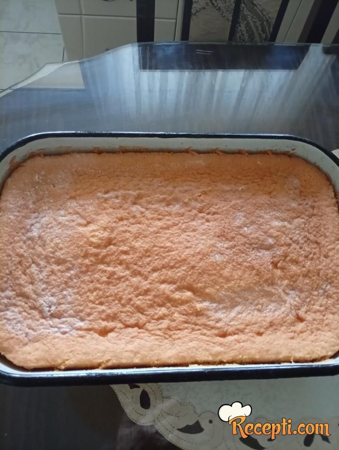 Vruć kolač preliti sa vrućim mlekom i ostaviti da dobro upije.