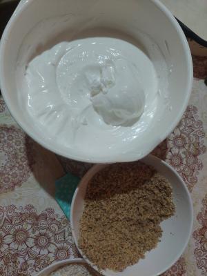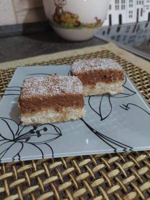 Belanca umutiti uz postepeno dodavanje šećera. Kada se lepo umuti umešati kokos, brašno i prašak za pecivo.