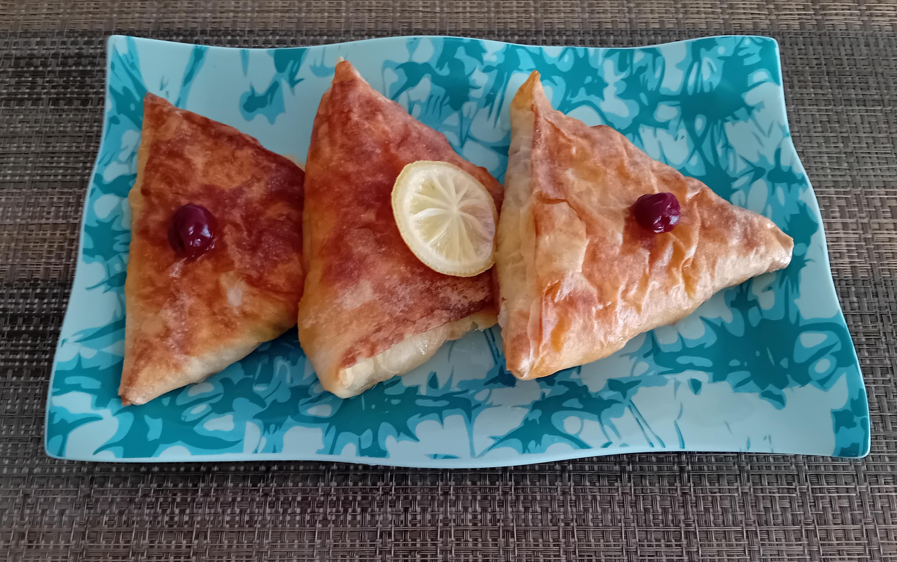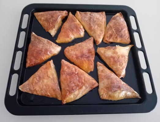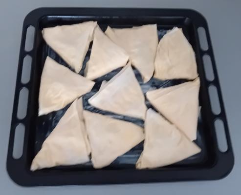 Postupak ponoviti sa preostalim korama i smesom od jaja. Pripremljene trouglove poređati u pleh koji ste premazali margarinom. Peći u dobro zagrejanoj rerni na 200 stepeni 20 minuta.
